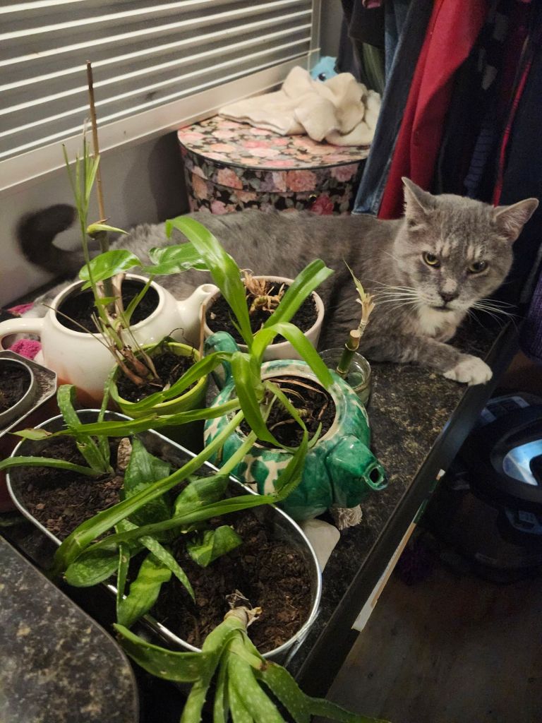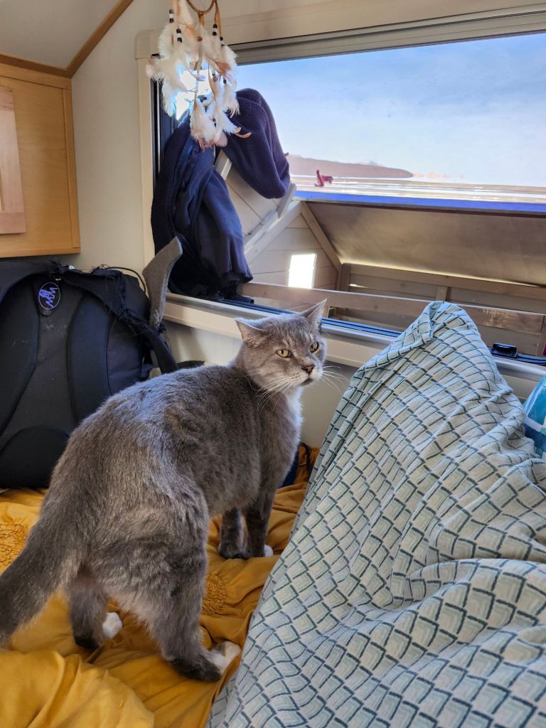 Boreas and I only made it about 30min up the road. Even though the weather app was showing no snow, it was still snowing. And snowing harder and harder as we drove further. As I started debating whether or not I should pull over, Boreas went into complete panic mode. Meowing like crazy, climbing all over the car, getting in my face. He’s usually really good about finding a spot to curl up and going to sleep, or just watching out the window. Sometimes he likes to get in my lap and sit, but I try to limit it unless we’re on a long stretch of highway. So, this freaked me out even more, and we took the next exit for Cove Fort and stopped at the gas station right off the highway. Boreas settled down almost instantly and we got comfy in the parking lot.
