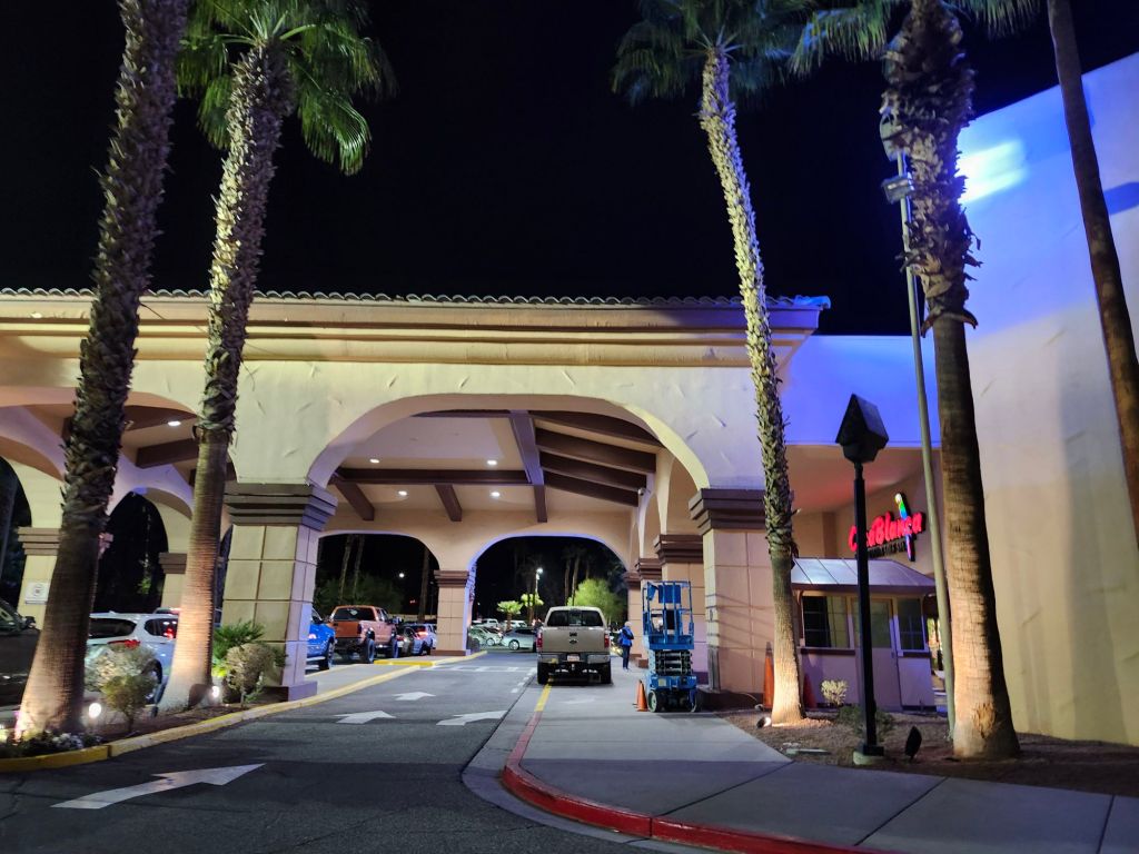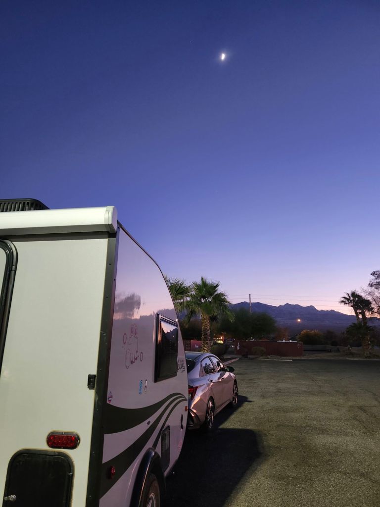 Uhaul had absolutely no problem installing the hitch receiver. Even though it was technically for a 2024 and all that, it matched up just fine. It did take them a lot longer to get the brake control installed, though. Technically I was supposed to be out of the campground by early afternoon, but I called them to let them know I’d be coming to get the camper and be out of the way as soon as the car was done. They really weren’t worried about it. I only saw two other campers the entire month that I was there. Apparently, November/Early December was too early for the snowbirds. I had gotten the camper mostly ready that morning before taking the car in, but it was already getting dark by the time I was all hooked up and ready to go. So, I went back to Henderson and found a quiet (or so I thought) parking lot for the night. My original plan was to park at the library, but when I got there the parking lot was packed even though they were getting ready to close. That was on the edge of a much larger shopping plaza. So, I drove a few rows down and parked for the night. This parking lot was completely empty when I parked, but before I knew it people trying to park at the library started spreading over to the larger parking lot, and within 30mins the place was packed. Cars, people, children and dogs all around me. Because across the street was a Christmas Parade and Street Festival. I had already gotten comfortable though. So, I went over and watched part of it, then back to the camper to make dinner. I would say the majority of people were gone again within an hour.